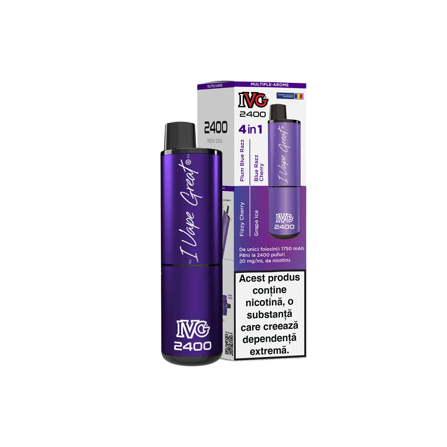 Numărul de pufuri este estimativ și poate varia în funcție de stilul de utilizare; inhalările mai lungi pot reduce autonomia totală. Dispozitivul conține 20 mg nicotină și este preumplut, gata de utilizare. IVG 2400 este conceput pentru a fi mai prietenos cu mediul, reducând semnificativ consumul de plastic și baterii față de dispozitivele clasice de unică folosință. Comparativ cu produse similare, oferă un randament superior per puf.